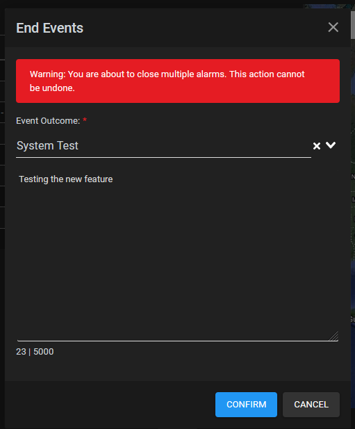 - Select the requred Alarm Events you want to end (or click "Select All")