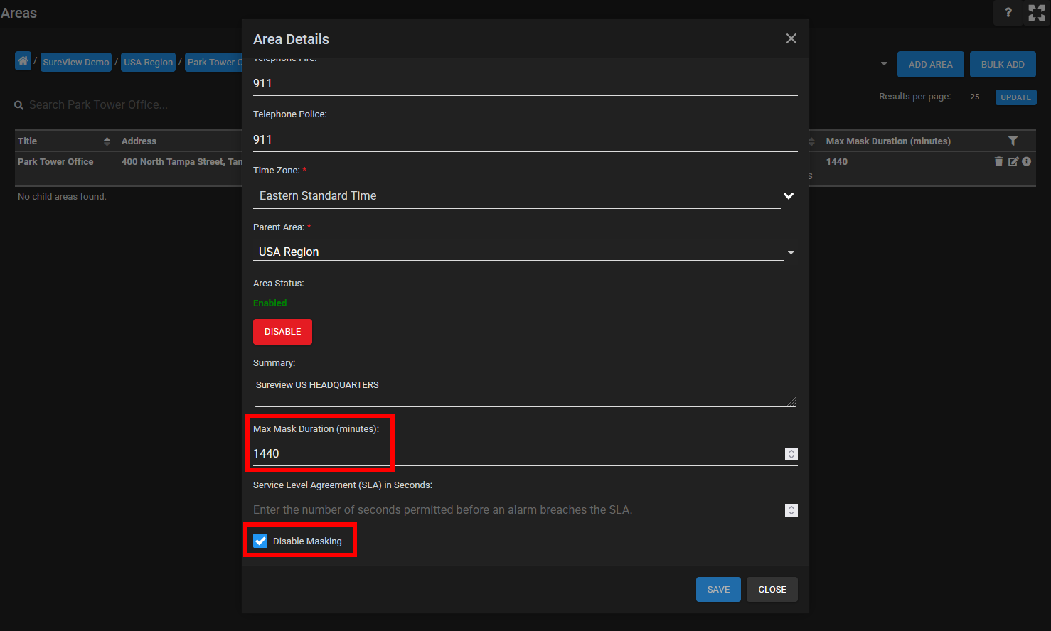 Individual Areas can be configured with specific Masking Permissions in the Area Setup screen