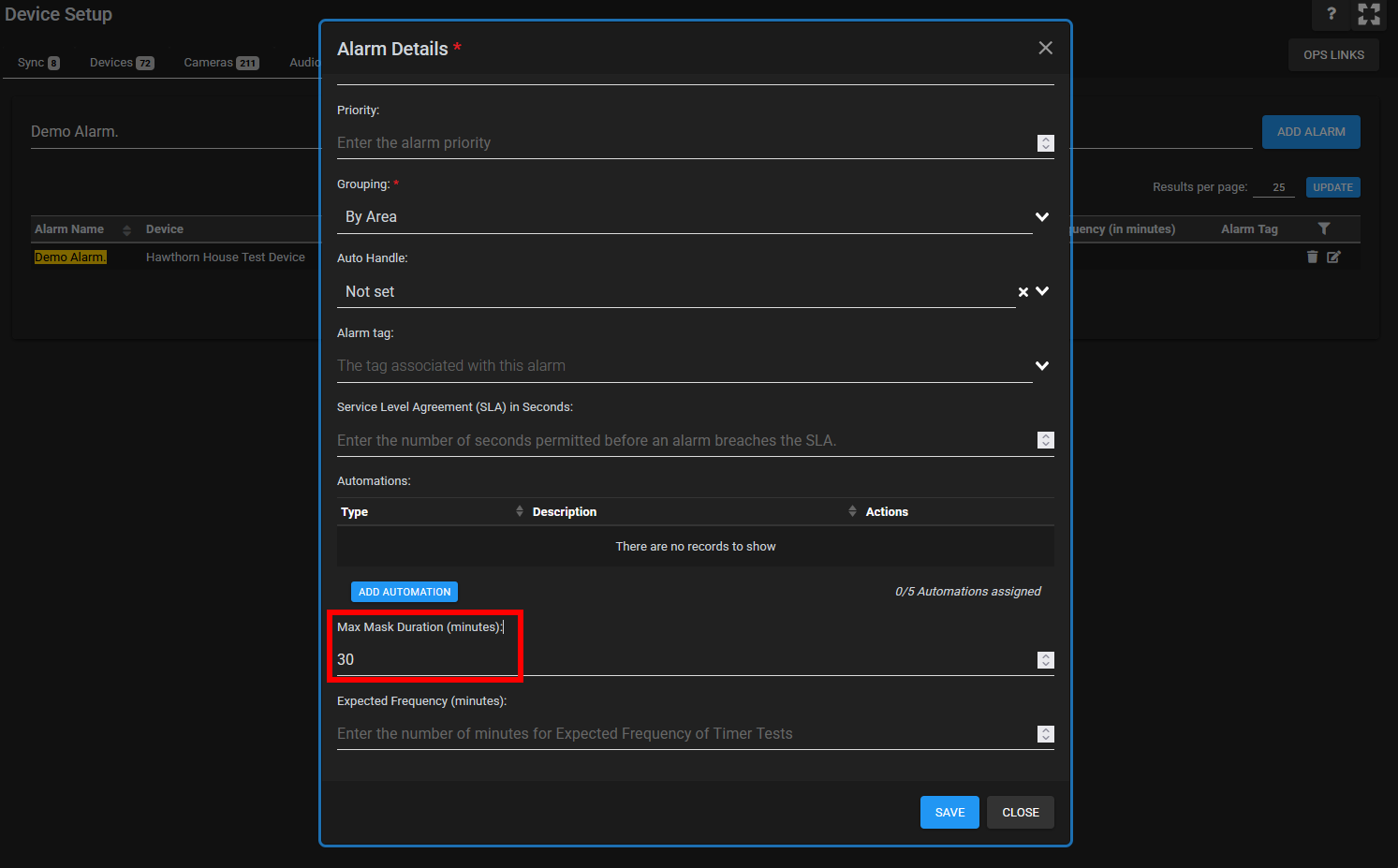 Individual Alarm points can be configured with a "Max Mask Duration (Minutes)" value in the Device Setup screen. This setting will override the Area Setup Max Mask Duration